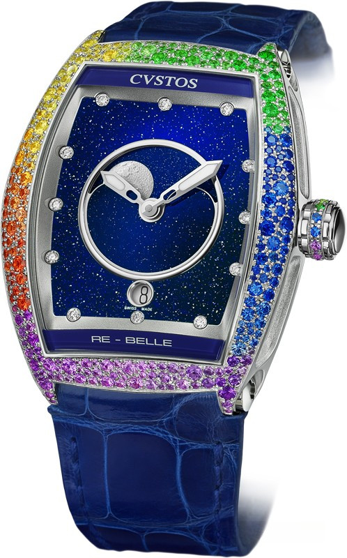 Часы Cvstos Re-Belle Moon представлены в корпусе из нержавеющей стали размером 36 х 47.2 мм водонепроницаемостью 100 метров. Внутри корпуса находится автоматический механизм, Калибр CVS882, обладающий запасом хода 38 часов. На синем авантюриновом циферблате с белыми бриллиантами отображаются часы, минуты, дата, фаза луны. Часы поставляются на ремешке из кожи аллигатора с вставкой из нержавеющей стали. Корпус инкрустирован разноцветными драгоценными камнями. Серия ограничена - 50 шт.