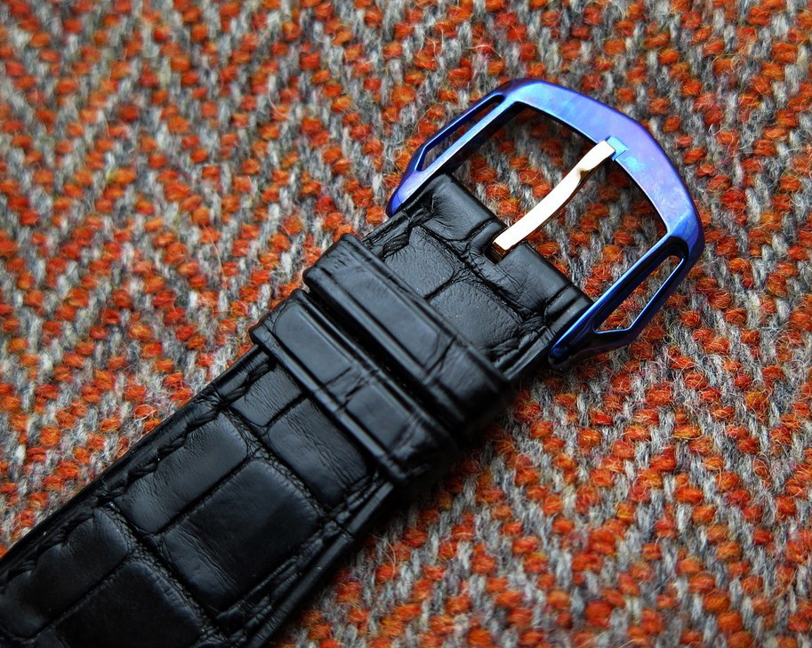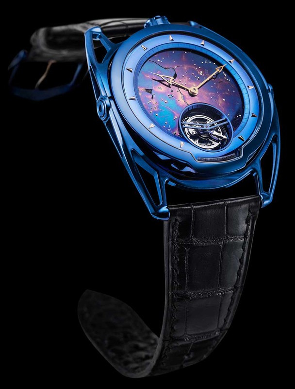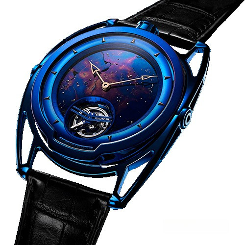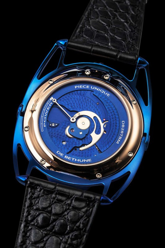 Часы De Bethune Unique Pieces DB28 Kind of Blue Tourbillon Meteorite представлены в корпусе из титана с покрытием DLC размером 42.6 мм водонепроницаемостью 30 метров. Внутри корпуса установлен механизм с ручным заводом, Калибр DB2019V3, обладающий запасом хода 5 дней. На синем циферблате отображаются часы, минуты, запас хода. Часы поставляются на ремешке из кожи аллигатора с титановой застежкой. Серия ограничена - 1 шт.