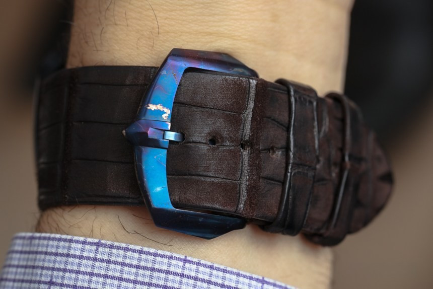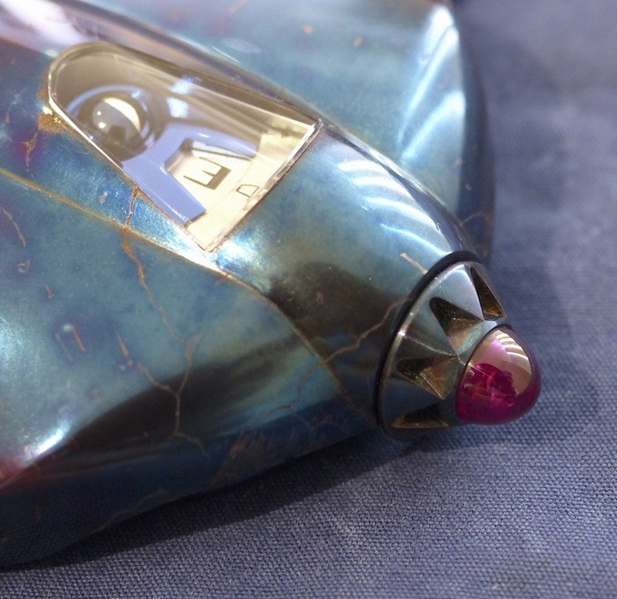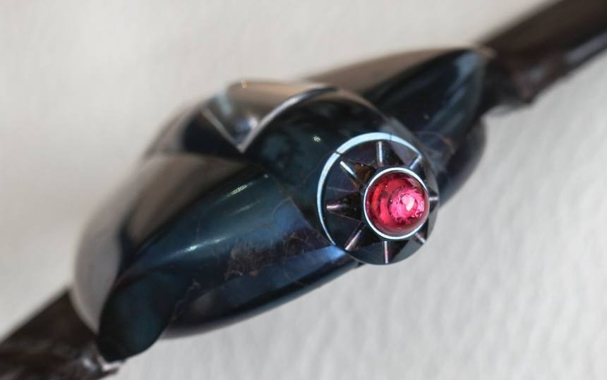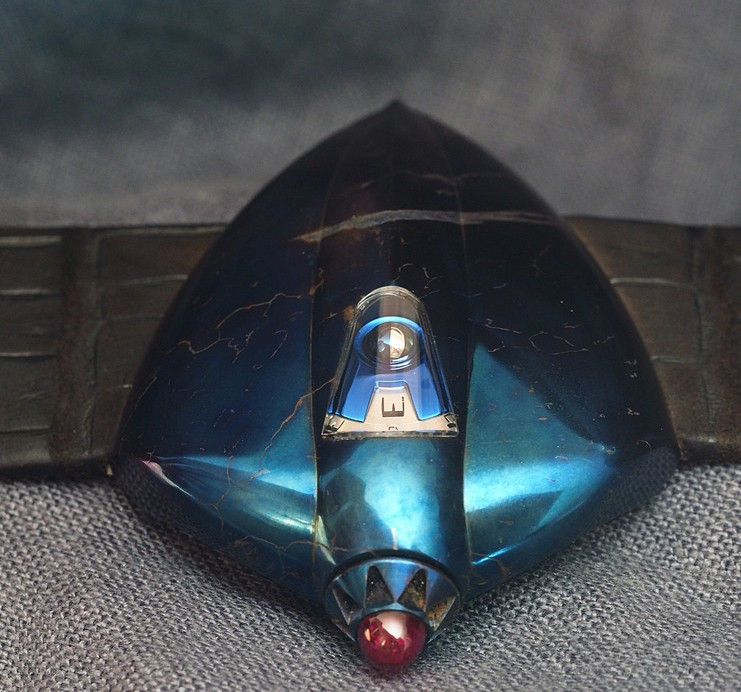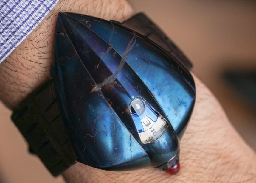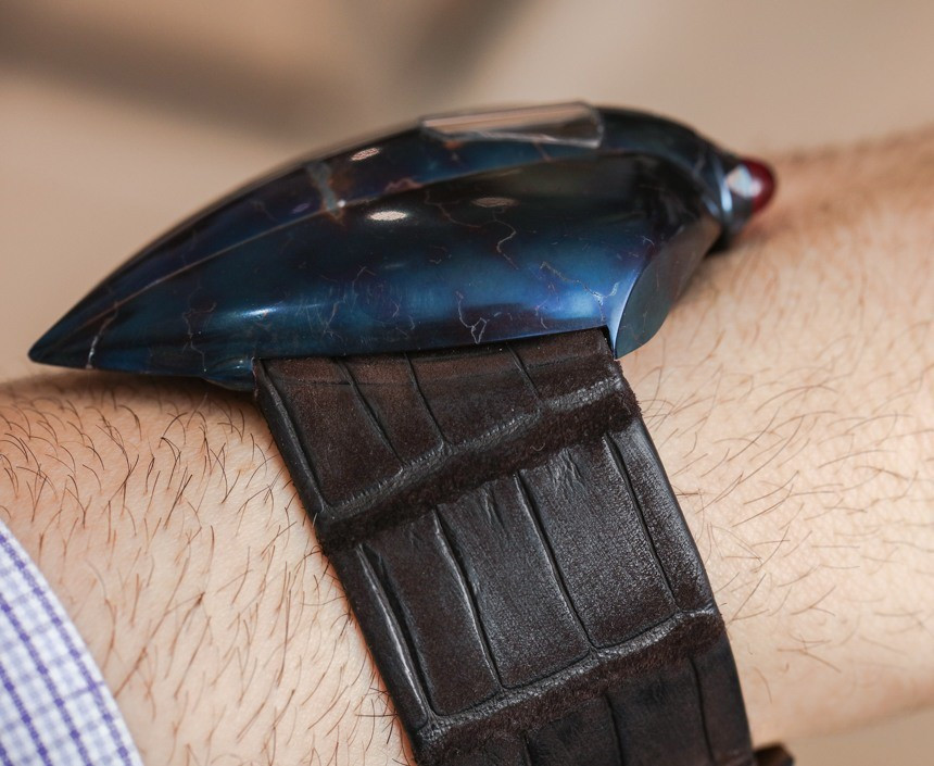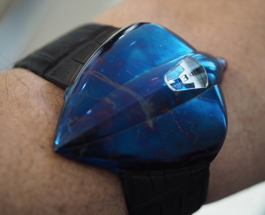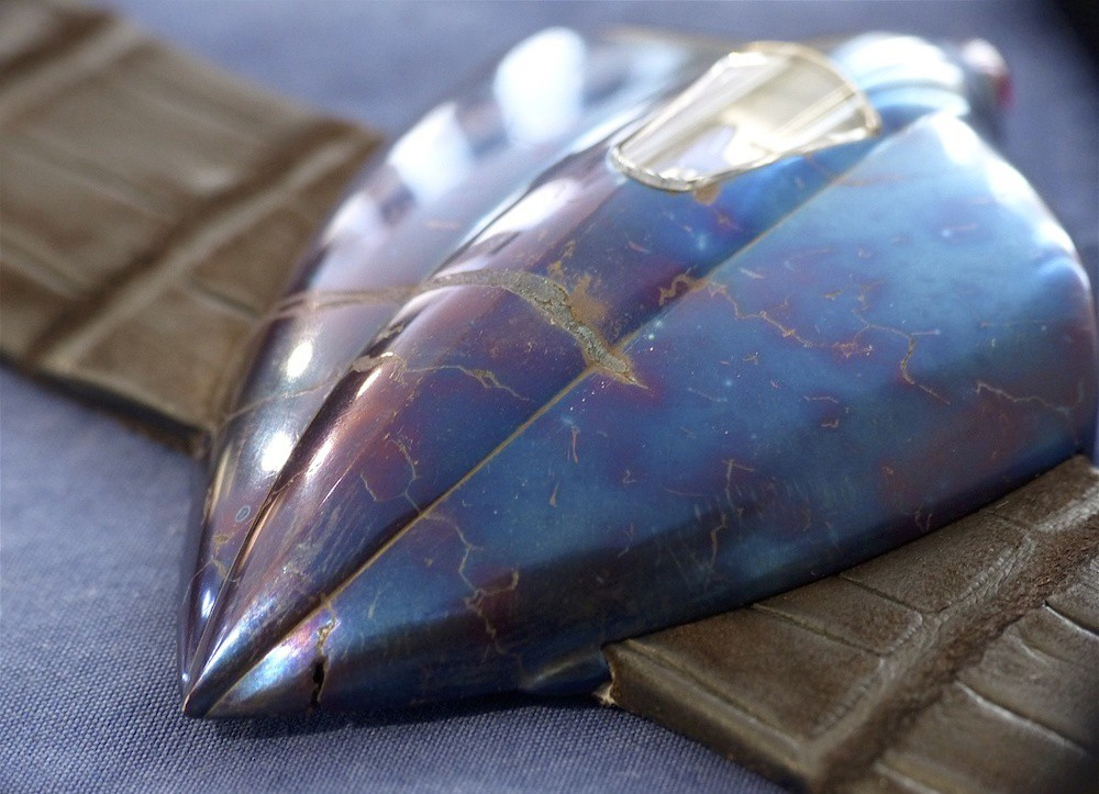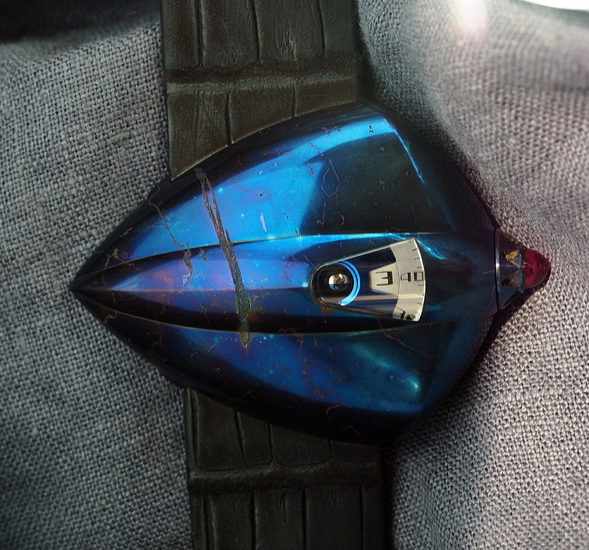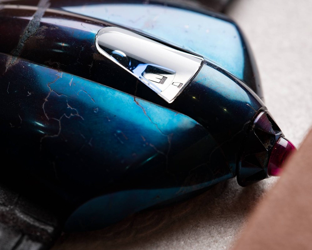Часы De Bethune Unique Pieces Dream Watch 5 Meteorite представлены в корпусе из метеорита размером 49 х 39 мм водонепроницаемостью 30 метров. Внутри корпуса установлен механизм с ручным заводом, обладающий запасом хода 5 дней. На синем циферблате отображаются часы, минуты, фаза луны. На обратной стороне часов расположен турбийон. Часы поставляются на ремешке из кожи аллигатора с титановой застежкой. Серия ограничена - 1 шт.