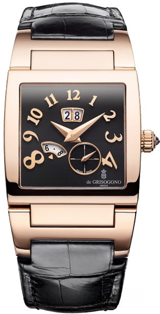 Часы de Grisogono Uno представлены в корпусе из розового золота 18к размером 33 мм и водонепроницаемостью до 30 метров. Внутри корпуса установлен автоматический механизм. На черном циферблате отображаются часы, минуты, секунды, дата, месяц. Часы комплектуются ремешком из кожи аллигатора с вставкой из розового золота 18к.