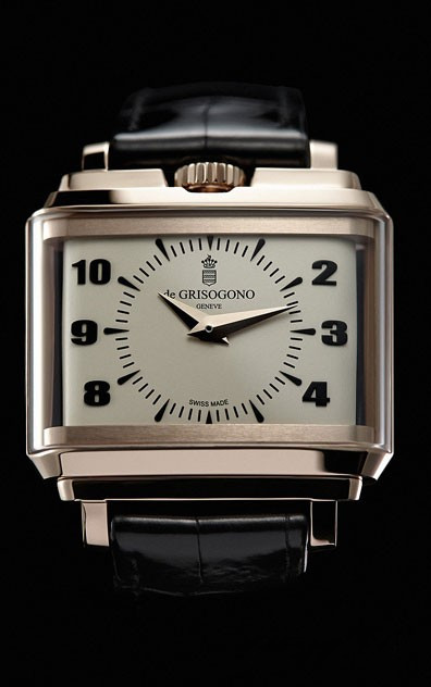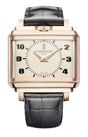 Корпус модели New Rerto 03 имеет прямоугольную форму, измеряет размеры: 50 х 44 мм и высотой 12 мм. Корпус с обеих сторон слегка изогнут. Матовый циферблат кремового цвета, украшен минутной разметкой (по центру образует круг), на внешней стороне разместились арабские цифры черного цвета. В центр помещены стрелки из цельного розового золота: часы и минуты. Заводная головка из розового золота 18к, помещена на 12 часов. Сапфировое стекло надежно защищает часы от царапин. Корпус обладает устойчивостью до 30 м. Во внутреннюю часть корпуса помещен автоматический часовой механизм с автоматическим подзаводом. Балансовая частота колебания - 28800 п/ч (4 Гц), обеспечивает беспрерывный ход 42 часа. Часы укомплектованы ремешком черного цвета из кожи аллигатора, который комфортно охватывает запястье, дополнен раскладывающейся застежкой из розового золота 18к.