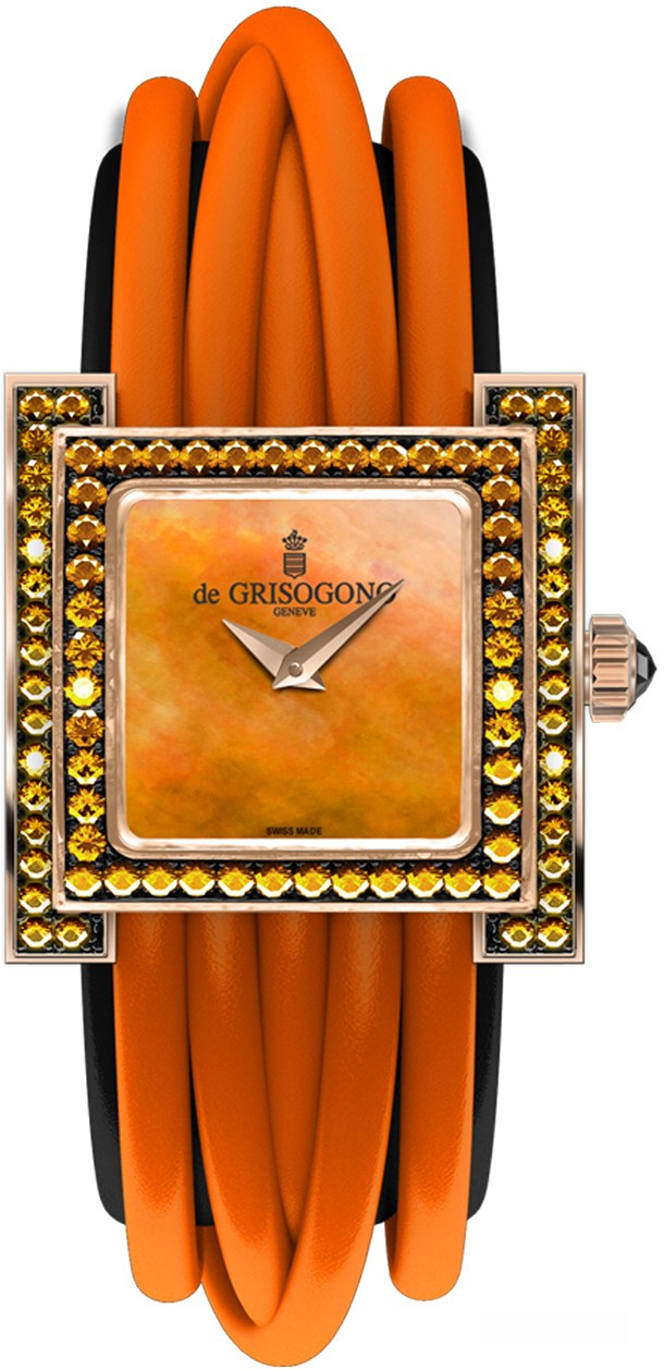 Часы Allegra выпущены в корпусе из розового золота 18к и укомплектованы швейцарским кварцевым часовым механизмом. На оранжевом жемчужном циферблате расположились золотые часовая и минутная стрелки в стиле dauphine. Безель часов инкрустирован оранжевыми сапфирами. Застёжка выдержана в стилистике коллекции Allegra и изготовлена из розового золота 18к. Коронка в характерном стиле марки de Grisogono с инкрустацией черным бриллиантом. Регулируемый ремешок, состоящий из 20 оранжевых переплетённых между собой кожаных полос.