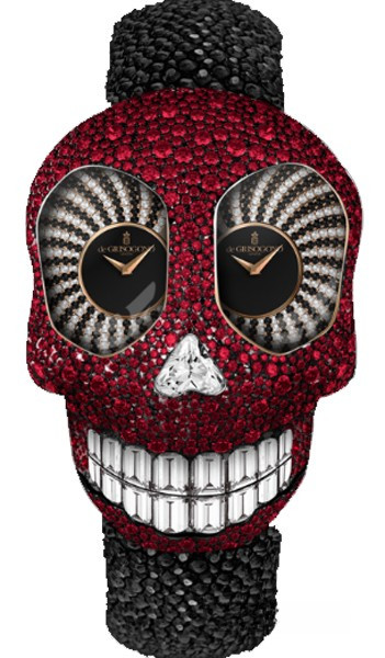Черепа использовались в ювелирных и часовых изделиях на протяжении десятилетий, но это первый раз, когда перед нами высокого ювелирный череп, выталкивающий свой язык. Вопреки многолетнему статусу самой мрачной части нашей анатомии – как и черепа-скульптуры Дэмиена Херста – череп часов Crazy Skull от De Grisogono смотрит на мир, широко улыбаясь прекрасным набором зубов, сделанных из белоснежных сверкающих бриллиантов в 7.70 карат багетной огранки. Сам череп – паве из 890 белых или черных бриллиантов – или рубинов, на ваш вкус – а нос представлен в виде белого бриллианта весом в 1.50 карат в форме сердца. Глубокие глазные отверстия, инкрустированные гипнотической спиралью из черных и белых бриллиантов, открывают вид на два отдельных циферблата – находчивый способ отображения индикаторов двух временных зон, которые обеспечиваются энергией швейцарскими кварцевыми часовыми механизмами. Настоящее веселье начинается, когда активируется механизм открытия челюсти и часы Crazy Skull ехидно демонстрируют свой милый розовый сапфировый или рубиновый язык – механизм, достигший совершенства спустя 9 месяцев разработки. Ни одна деталь не лишена внимания, в том числе восхитительная застежка в форме скрещенных костей, инкрустированных белыми бриллиантами или рубинами, на ремешке из кожи ската с фирменной печатью De Grisogono.