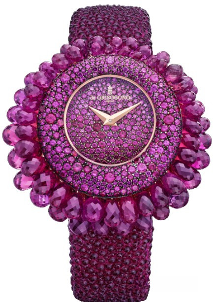 Часы Grappoli представляют собой уникальный симбиоз Высокого ювелирного искусства и часового мастерства. Особое внимание ювелиры марки de Grisogono уделили великолепию драгоценных камней, необычной огранке и безупречности технике паве. Благодаря ней каждый драгоценный камень приобретает особую выразительность, а огранка формы «бриолет» и мастерство закрепки позволяет камням, словно по волшебству, парить в воздухе, искрясь при каждом движении руки. de Grisogono создает произведения Высокого ювелирного искусства, следуя своему девизу: «Красота дерзости». Корпус и циферблат модели изобилует красными рубинами и рубеллитами. Часы комплектуются сиреневым ремешком из кожи электрического ската с золотой застежкой.