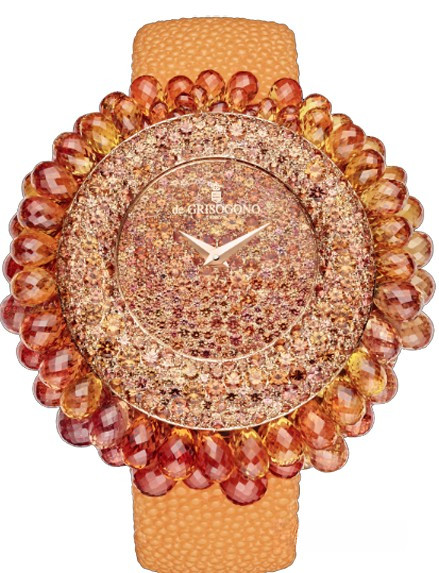 Часы Grappoli представляют собой уникальный симбиоз Высокого ювелирного искусства и часового мастерства. Особое внимание ювелиры марки de Grisogono уделили великолепию драгоценных камней, необычной огранке и безупречности технике паве. Благодаря ней каждый драгоценный камень приобретает особую выразительность, а огранка формы «бриолет» и мастерство закрепки позволяет камням, словно по волшебству, парить в воздухе, искрясь при каждом движении руки. de Grisogono создает произведения Высокого ювелирного искусства, следуя своему девизу: «Красота дерзости». Корпус и циферблат модели изобилует оранжевыми сапфирами. Часы комплектуются оранжевым ремешком из кожи электрического ската с золотой застежкой.