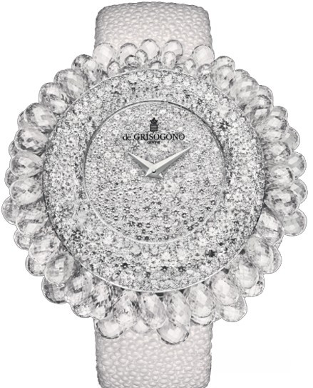 Часы Grappoli представляют собой уникальный симбиоз Высокого ювелирного искусства и часового мастерства. Особое внимание ювелиры марки de Grisogono уделили великолепию драгоценных камней, необычной огранке и безупречности технике паве. Благодаря ней каждый драгоценный камень приобретает особую выразительность, а огранка формы «бриолет» и мастерство закрепки позволяет камням, словно по волшебству, парить в воздухе, искрясь при каждом движении руки. de Grisogono создает произведения Высокого ювелирного искусства, следуя своему девизу: «Красота дерзости». Корпус и циферблат модели изобилует белыми бриллиантами. Часы комплектуются белым ремешком из кожи электрического ската с золотой застежкой.