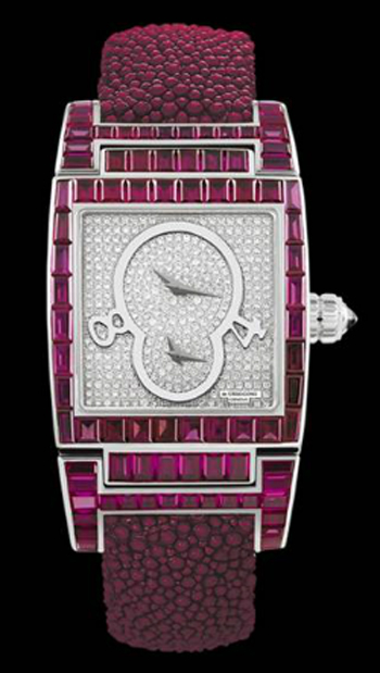 водонепроницаемость 30 м, корпус инкрустирован 88-ю багетными рубинами 9.85 ct., заводная головка инкрустирована черным бриллиантом