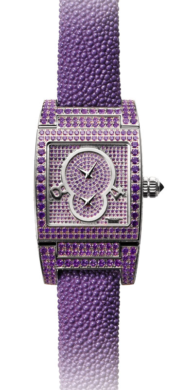 водонепроницаемость 30 м, корпус инкрустирован фиолетовыми сапфирами