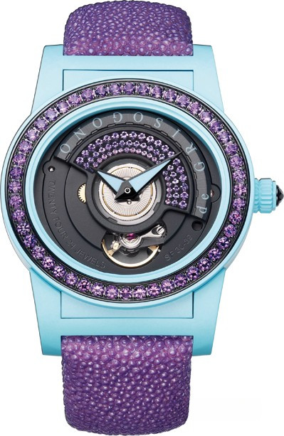 Часы представлены в корпусе из композита размером 49 х 43 х 12 мм и водонепроницаемостью до 30 метров. Внутри корпуса установлен автоматический механизм SF 30-89 с запасом хода 42 часа. На черном циферблате с фиолетовыми аметистами отображаются часы и минуты. Часы комплектуются ремешком из кожи ската с вставкой из нержавеющей стали. Безель из фиолетовых аметистов.
