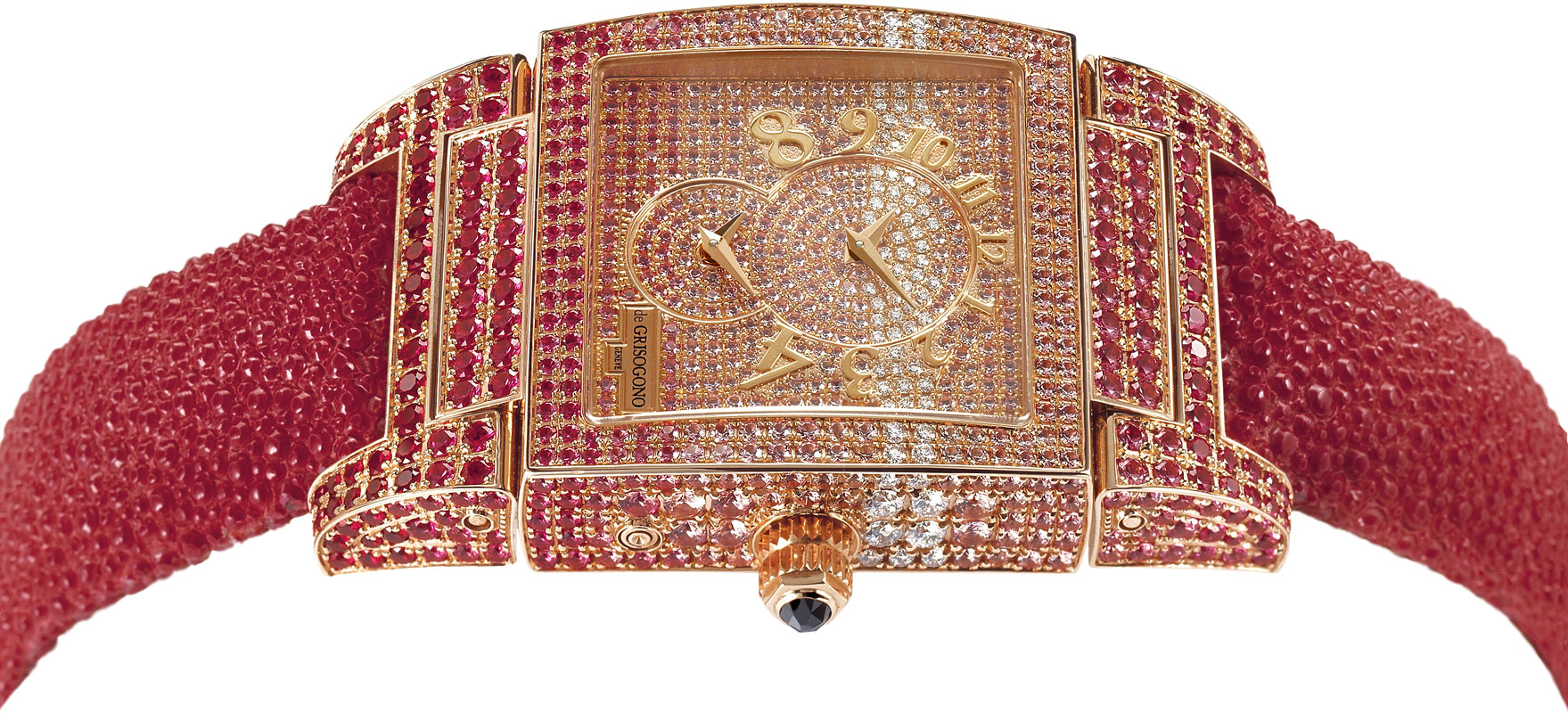 водонепроницаемость 30 м, корпус инкрустирован розовыми сапфирами, красными рубинами