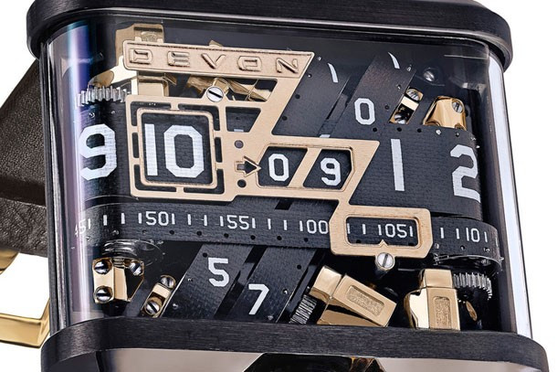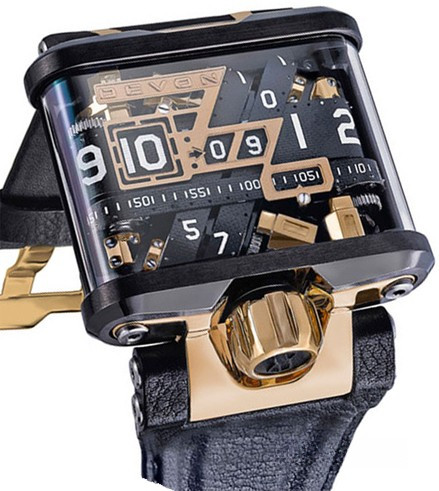 Devon Tread 1G - часы из 18-каратного желтого золота и нержавеющей стали с черным DLC покрытием. Эти особенные часы изготавливают на заказ. Коронка, пряжка, покрытие мотора и индикаторов выполнено из чистого золота, дополняя другие детали сделанные из нержавеющей стали с черным DLC покрытием. Размеры корпуса 53.3 х 47 х 19 мм. Если бы Tread 1 был выполнен полностью из чистого золота, то в результате часы получились бы слишком тяжелыми для ношения, таким образом сочетание золота и нержавеющей стали является отличной золотой серединой. В частности, индикаторы лучше смотрятся в золоте, в отличие от черного механизма и «ремешков». Devon Tread 1G изготавливают на заказ по цене от $ 35000.