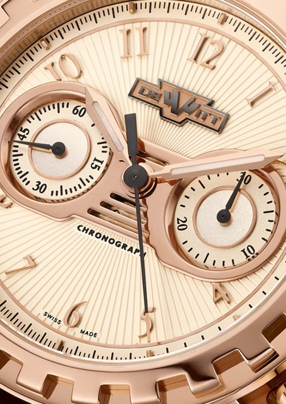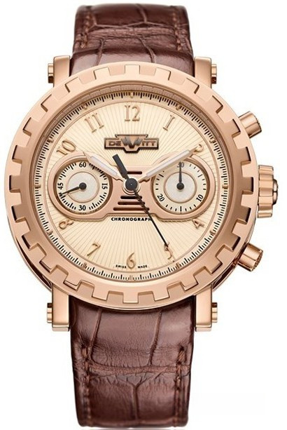 Мужские часы DeWitt Academia Chronostream AC.6005.053.M092 представляют функцию хронографа. Накопители хронографа расположены симметрично на 3-х и 9-ти часах. Корпус модели диаметром 43 мм изготовлен из розового золота 18к, водонепроницаемость составляет 30 метров. На фоне бежевого гильошированного циферблата под сапфировым стеклом отображаются часы, минуты и секунды. Внутри корпуса установлен автоматический механизм, произведенный на мануфактуре DeWitt, обладающий запасом хода 48 часов. Часы комплектуются черым ремешком из кожи аллигатора с застежкой из розового золота 18к.