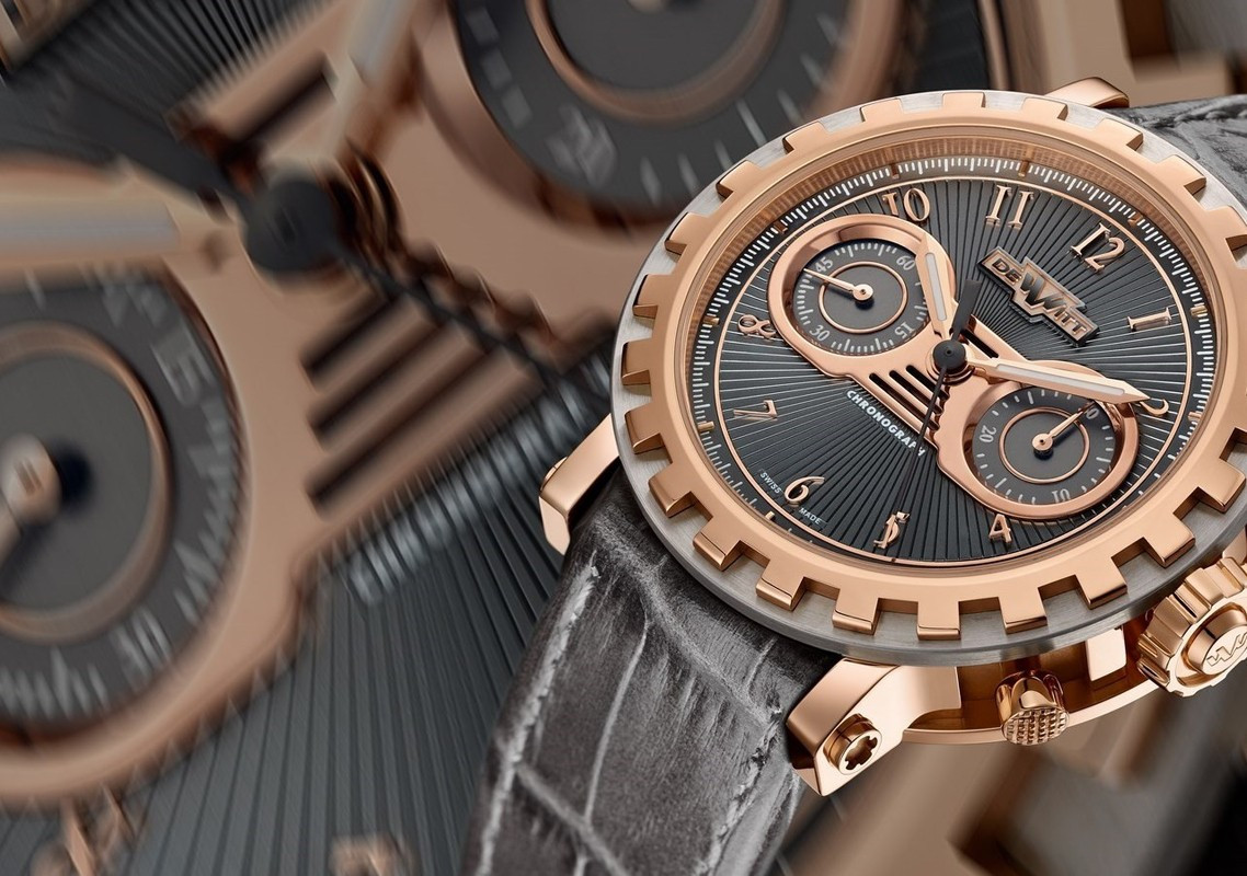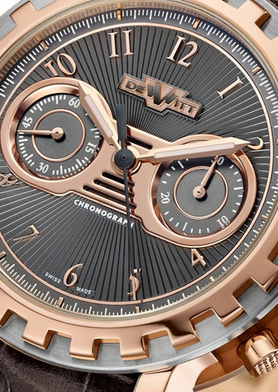Мужские часы DeWitt Academia Chronostream AC.6005.058.M091 представляют функцию хронографа. Накопители хронографа расположены симметрично на 3-х и 9-ти часах. Корпус модели диаметром 43 мм изготовлен из розового золота 18к, водонепроницаемость составляет 30 метров. На фоне бежевого гильошированного циферблата под сапфировым стеклом отображаются часы, минуты и секунды. Внутри корпуса установлен автоматический механизм, произведенный на мануфактуре DeWitt, обладающий запасом хода 48 часов. Часы комплектуются черым ремешком из кожи аллигатора с застежкой из розового золота 18к.
