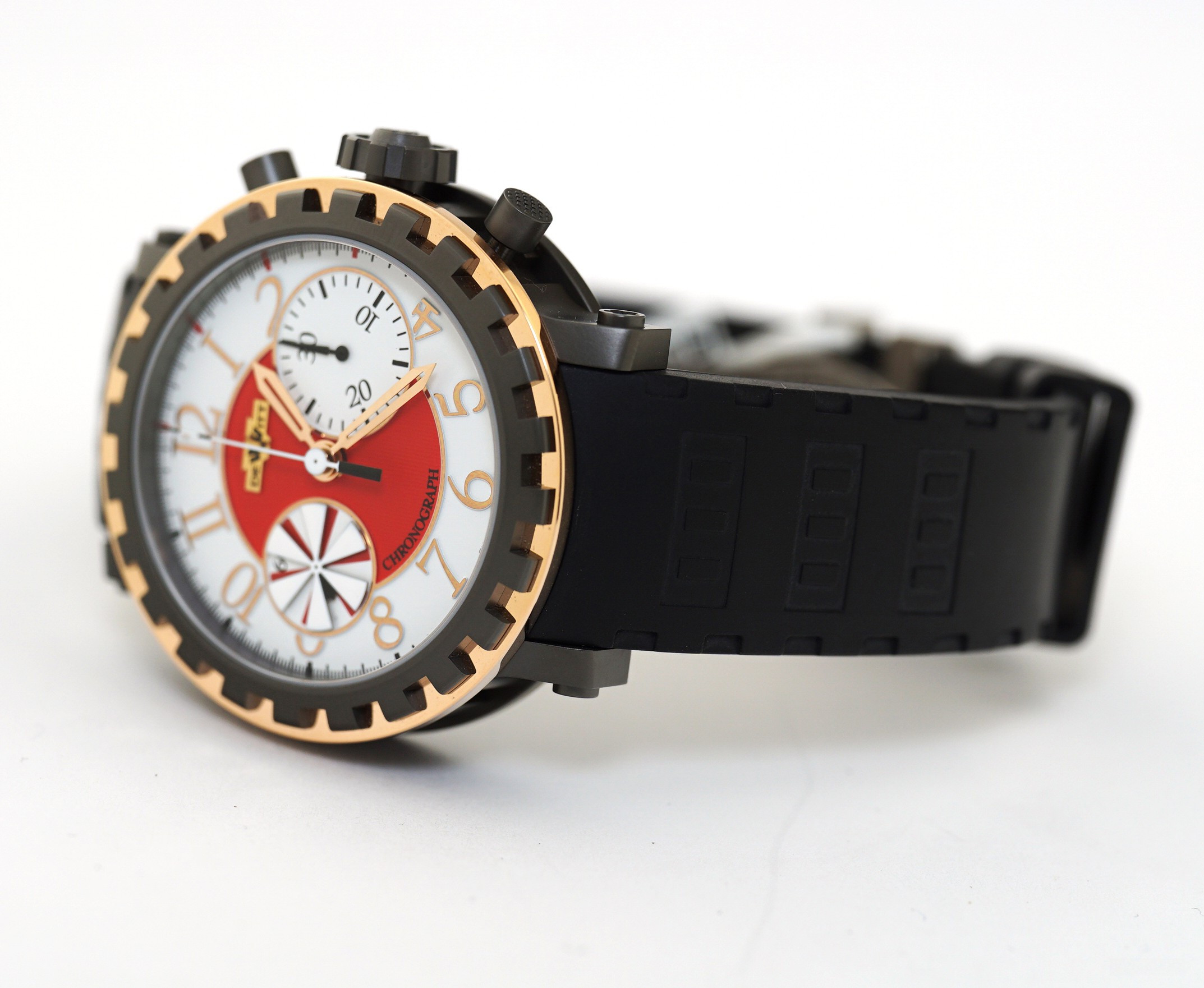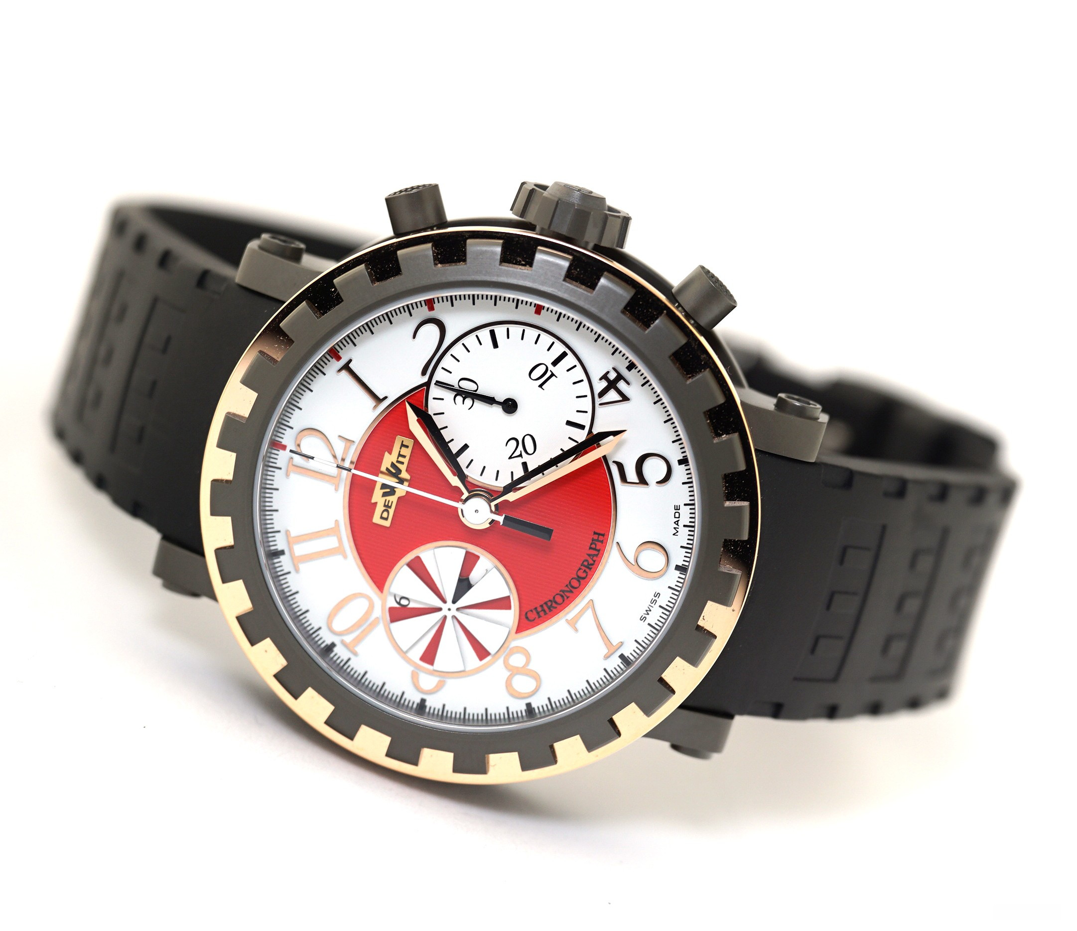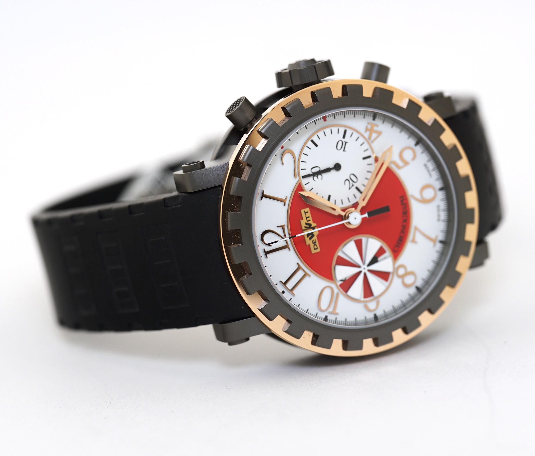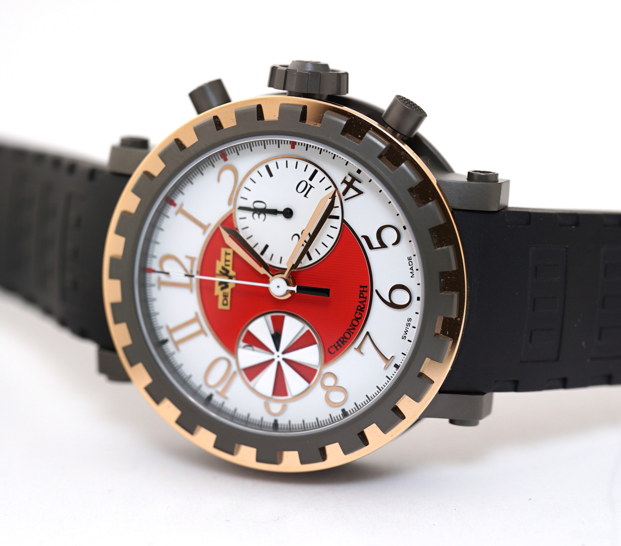 Мужские часы DeWitt Academia Chronostream представлены в корпусе диаметром 43 мм из розового золота 18к и титана, водонепроницаемость составляет 30 метров. На белом с красным циферблате под сапфировым стеклом отображаются часы, минуты и секунды. Накопители хронографа расположены симметрично на 3-х и 9-ти часах. Внутри корпуса установлен автоматический механизм, произведенный на мануфактуре DeWitt, обладающий запасом хода 48 часов. Часы комплектуются каучуковым ремешком с титановой вставкой.