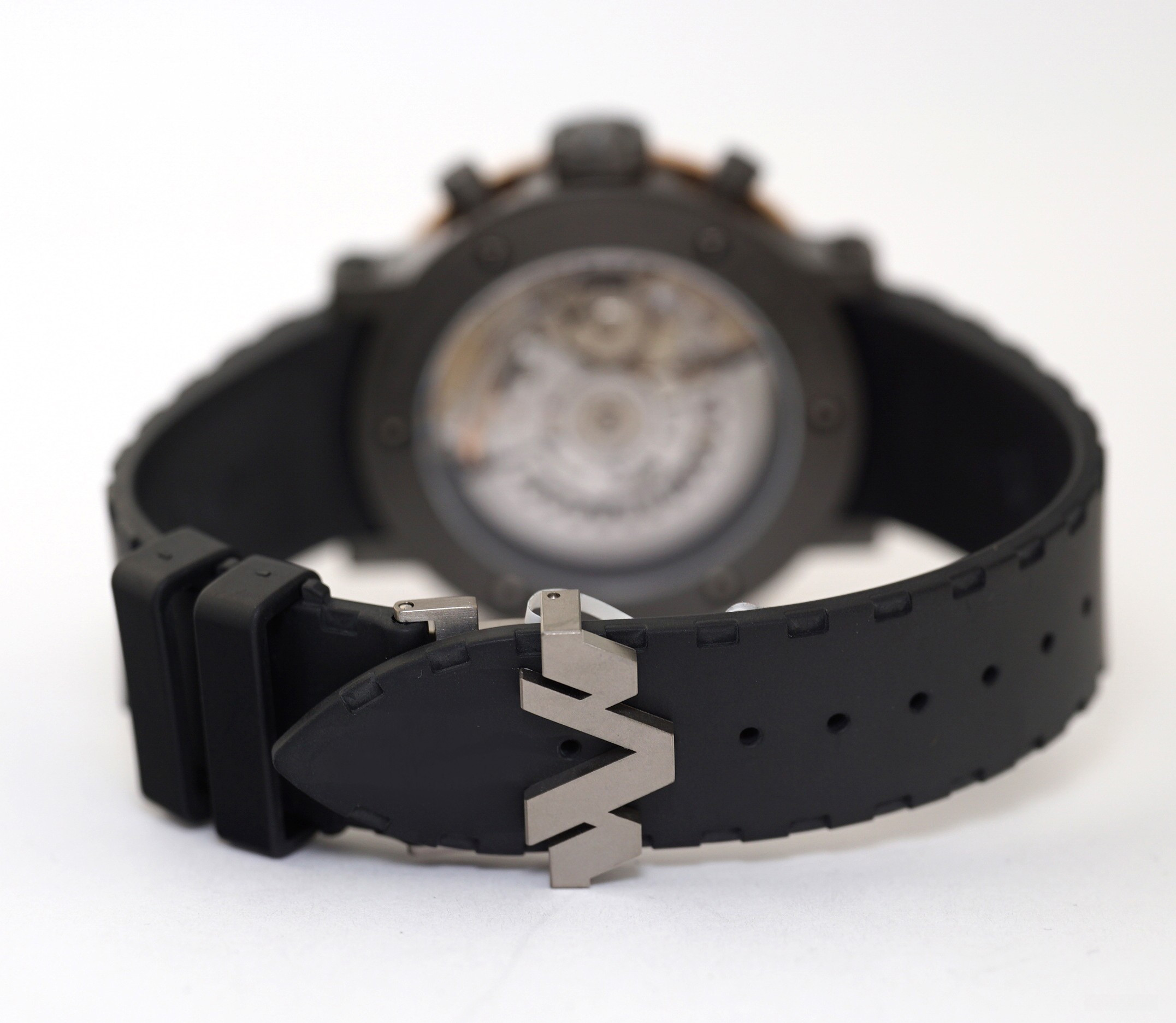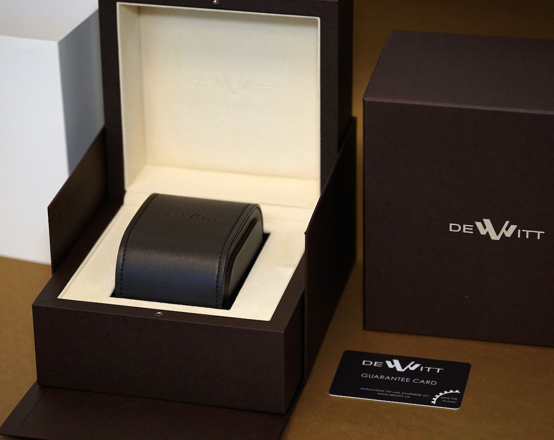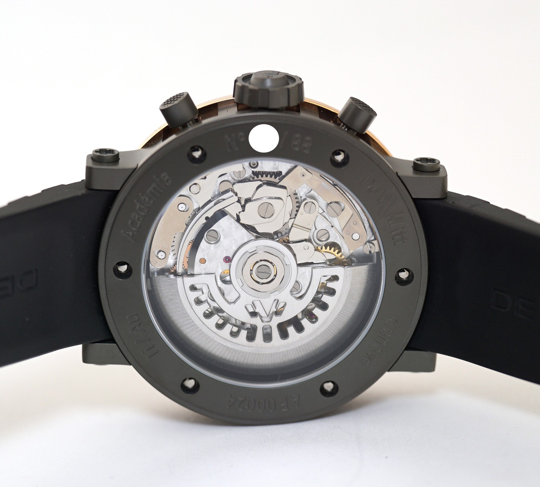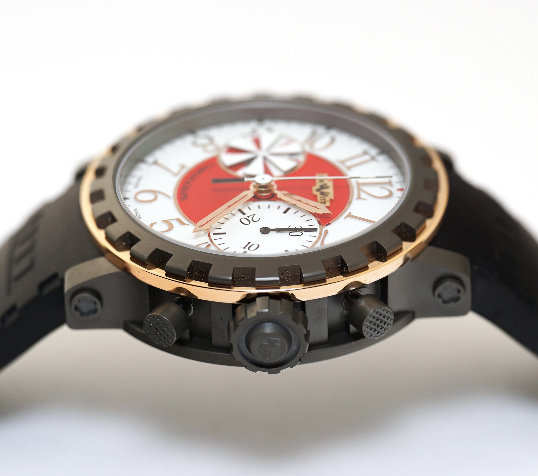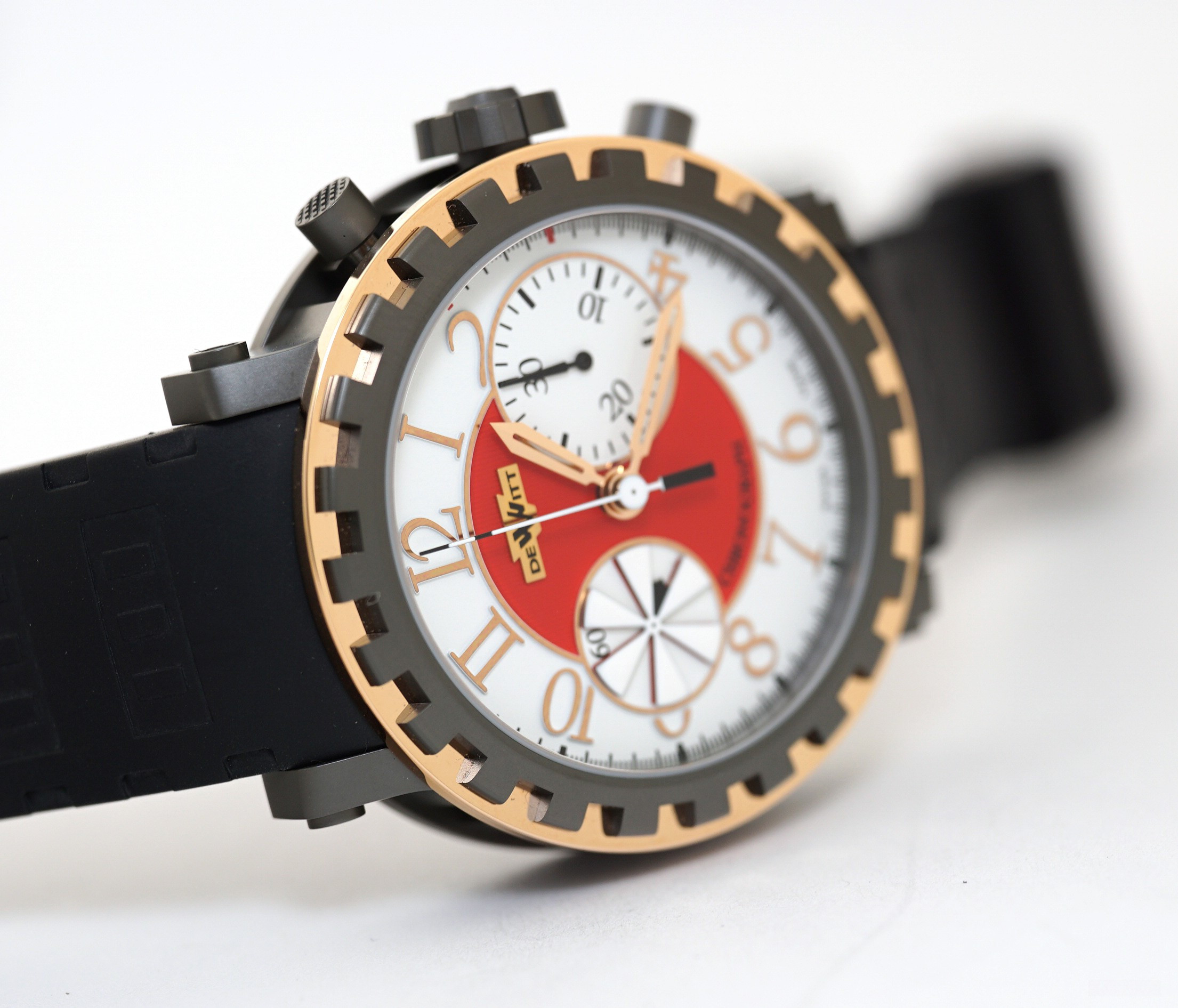 Мужские часы DeWitt Academia Chronostream представлены в корпусе диаметром 43 мм из розового золота 18к и титана, водонепроницаемость составляет 30 метров. На белом с красным циферблате под сапфировым стеклом отображаются часы, минуты и секунды. Накопители хронографа расположены симметрично на 3-х и 9-ти часах. Внутри корпуса установлен автоматический механизм, произведенный на мануфактуре DeWitt, обладающий запасом хода 48 часов. Часы комплектуются каучуковым ремешком с титановой вставкой.