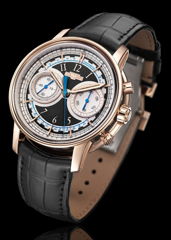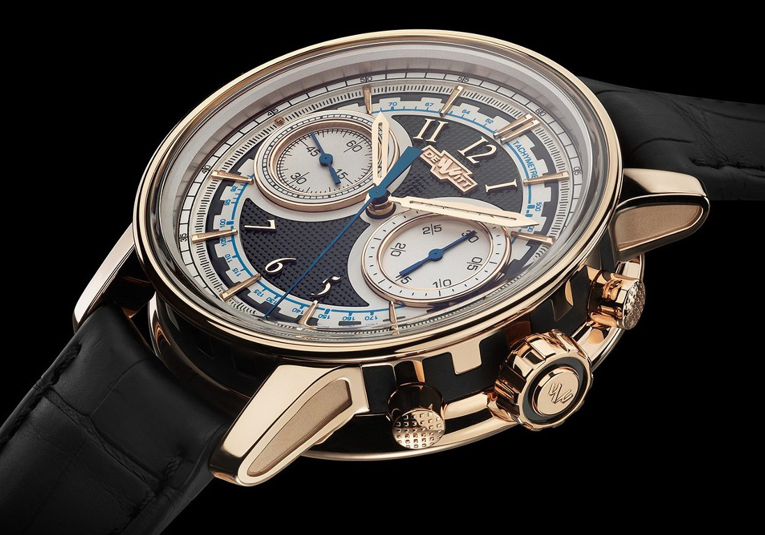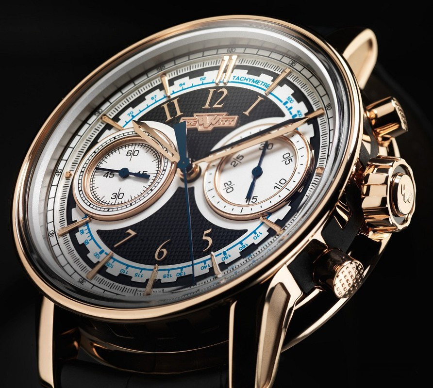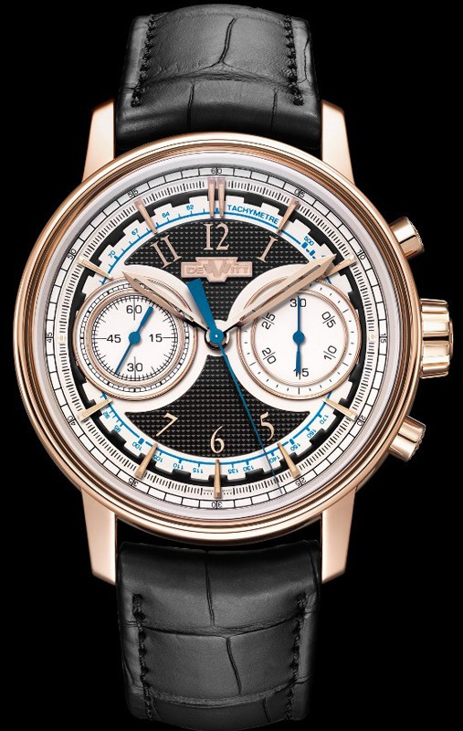 Мужские часы DeWitt Academia Chronostream II AC.CHR.001 представляют функцию хронографа. Накопители хронографа расположены симметрично на 3-х и а 9-ти часах. Корпус модели диаметром 42.5 мм изготовлен из розового золота 18к, водонепроницаемость составляет 30 метров. На фоне черного гильошированного узором Clou de Paris циферблата под сапфировым стеклом отображаются часы, минуты и секунды. По внутренней окружности нанесена тахиметрическая шкала. Внутри корпуса установлен автоматический механизм, произведенный на мануфактуре DeWitt, обладающий запасом хода 48 часов. Часы комплектуются черым ремешком из кожи аллигатора с застежкой из розового золота 18к.