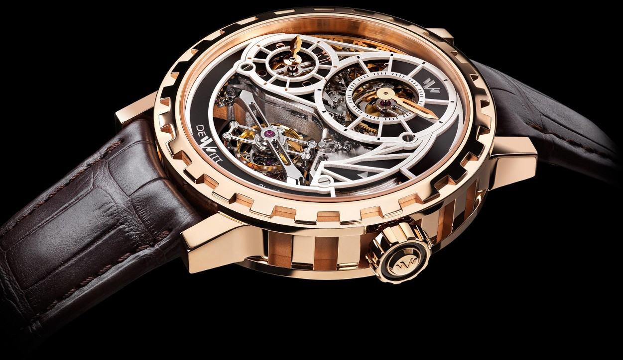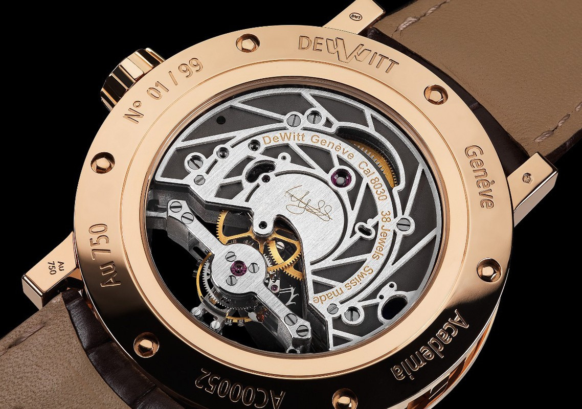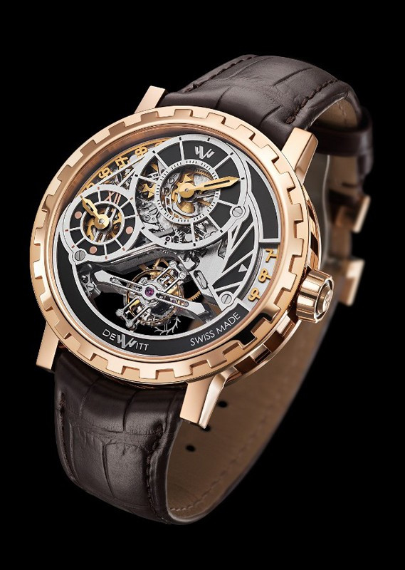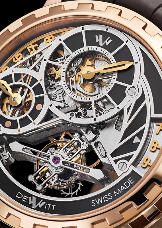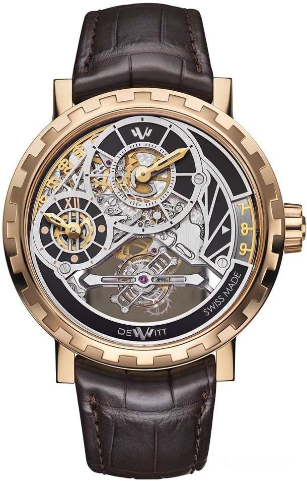 DeWitt анонсирует свое самое последнее открытие в области технических инноваций, часы Academia Grand Tourbillon, выпущенные ограниченной серией в 99 экземпляров. Калибр традиционной конструкции, состоящий из 327 деталей, имеет хорошо зарекомендовавшие себя технические характеристики: 18 000 полуколебаний в час, запас хода 65 часов, швейцарский анкерный спуск, спираль Straumann с кривой Филлипса (2,5 Гц). Уникальный стиль и творческое своеобразие DeWitt нашли свое выражение в разработке оригинальной "прыгающей" индикации часов и минут, отличной от привычного в часовом искусстве исполнения. При установке времени циферблат часов оживает: запускается перемещение гребенки, при переходе от минуты к минуте в движение приходит лапка, словно призывая заглянуть в самую глубину необыкновенно сложной механической конструкции. Часы Academia Grand Tourbillon в круглом корпусе из розового золота диаметром 46 мм со знаменитыми имперскими колоннами. Под задней крышкой из сапфирового стекла расположен индикатор день/ночь: синий цвет обозначает ночь, а белый – день. Заводная головка и застежка ремешка из розового золота 750 пробы отмечены монограммой "W".