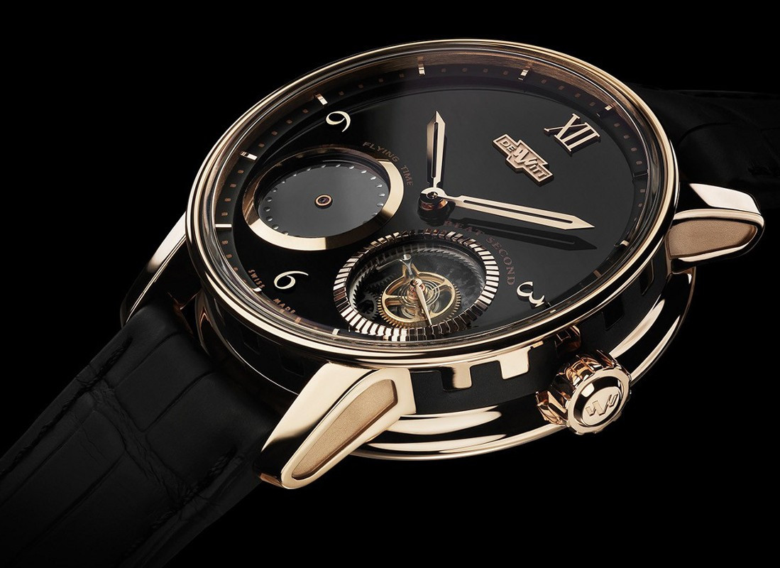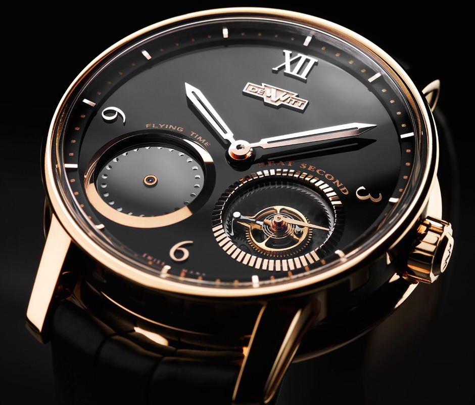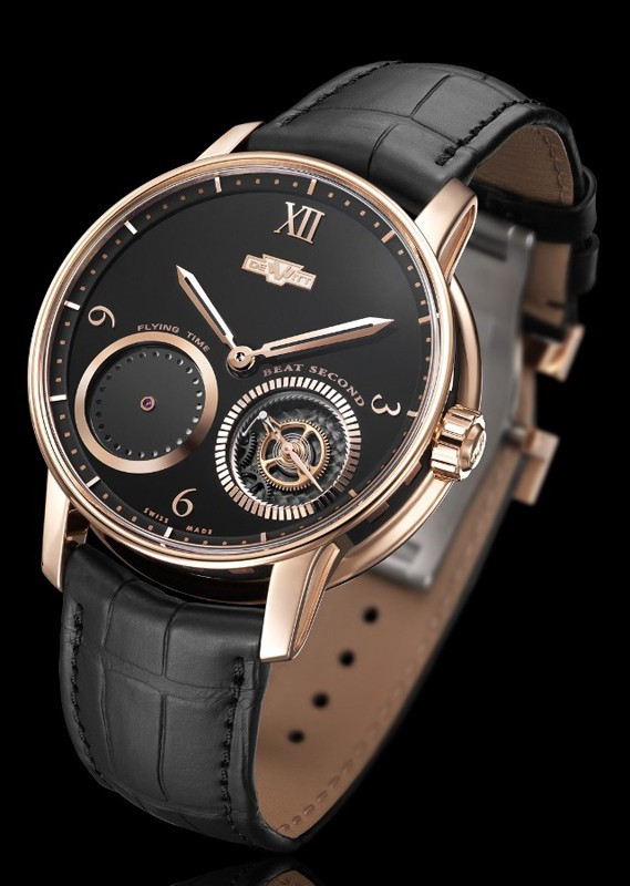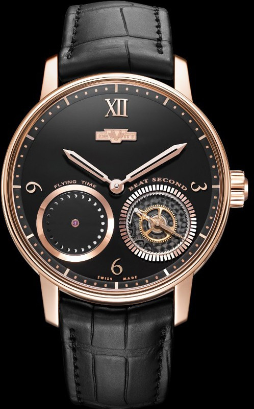 Мужские часы DeWitt Academia Out of Time AC.OUT.001 представляют функцию прыгающей секундной стрелки. Индикатор beat second находится на 4-х часах. Корпус модели диаметром 42.5 мм изготовлен из розового золота 18к, водонепроницаемость составляет 30 метров. На фоне черного циферблата под сапфировым стеклом отображаются часы, минуты и секунды. Внутри корпуса установлен автоматический механизм, произведенный на мануфактуре DeWitt, обладающий запасом хода 65 часов. Часы комплектуются черым ремешком из кожи аллигатора с застежкой из розового золота 18к.