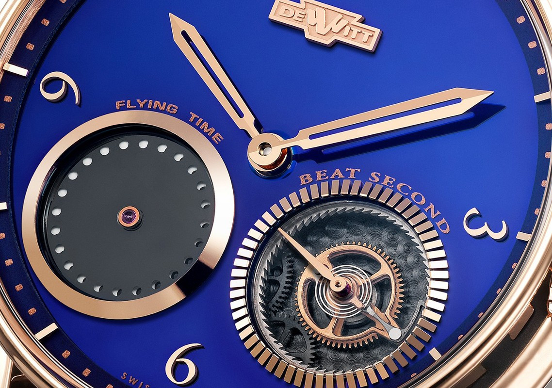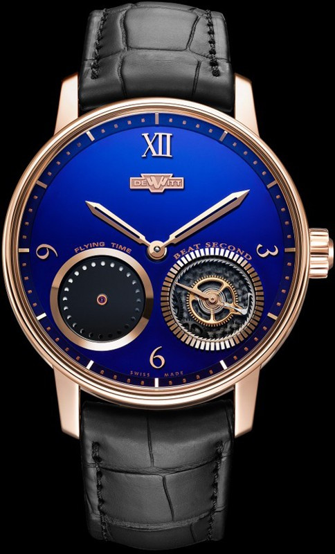 Мужские часы DeWitt Academia Out of Time AC.OUT.003 представляют функцию прыгающей секундной стрелки. Индикатор beat second находится на 4-х часах. Корпус модели диаметром 42.5 мм изготовлен из розового золота 18к, водонепроницаемость составляет 30 метров. На фоне синего с черным циферблата под сапфировым стеклом отображаются часы, минуты и секунды. Внутри корпуса установлен автоматический механизм, произведенный на мануфактуре DeWitt, обладающий запасом хода 65 часов. Часы комплектуются черым ремешком из кожи аллигатора с застежкой из розового золота 18к.