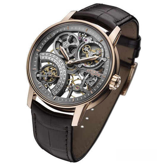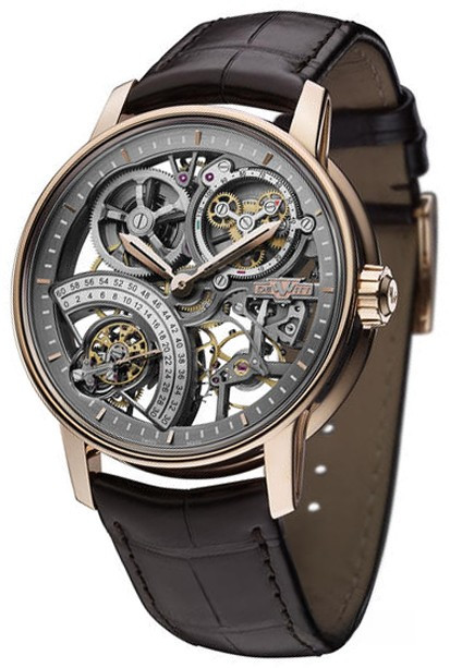 Механизм с ручным заводом собран из 263 деталей. Он помещен в новый корпус Academia диаметром 42.5 мм. Сияющее розовое золото 18к и каучук воссоздают имперские колонны, которые являются символом часовой мануфактуры. Толщина корпуса составляет 10.3 мм. На обратной стороне корпуса сквозь сапфировое стекло можно наблюдать за скульптурным рельефом Калибра, ощущая чувство объема и перспективы. На сером скелетированном циферблате отображаются часы, минуты, секунды, запас хода. Часы комплектуются ремешком из кожи аллигатора с золотой застежкой Водонерпоницаемость корпуса составляет 30 метров.