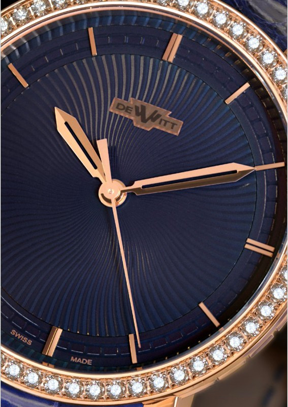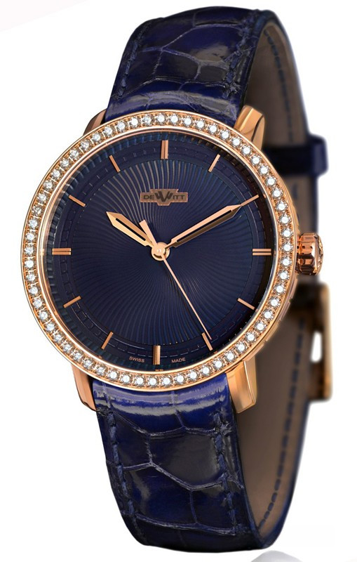 Мужские часы DeWitt Classic HMS Jewellery CLA.HMS/102.003 представлены в классическом круглом корпусе диаметром 40 мм из розового золота 18к, водонепроницаемость составляет 30 метров. На фоне синего гильошированного циферблата под сапфировым стеклом отображаются часы, минуты и секунды. Внутри корпуса установлен автоматический механизм, произведенный на мануфактуре DeWitt, обладающий запасом хода 42 часа. Безель из 60-ти белых бриллиантов общим весом 1.39 ct. Часы комплектуются черным ремешком из кожи аллигатора с застежкой из розового золота 18к.