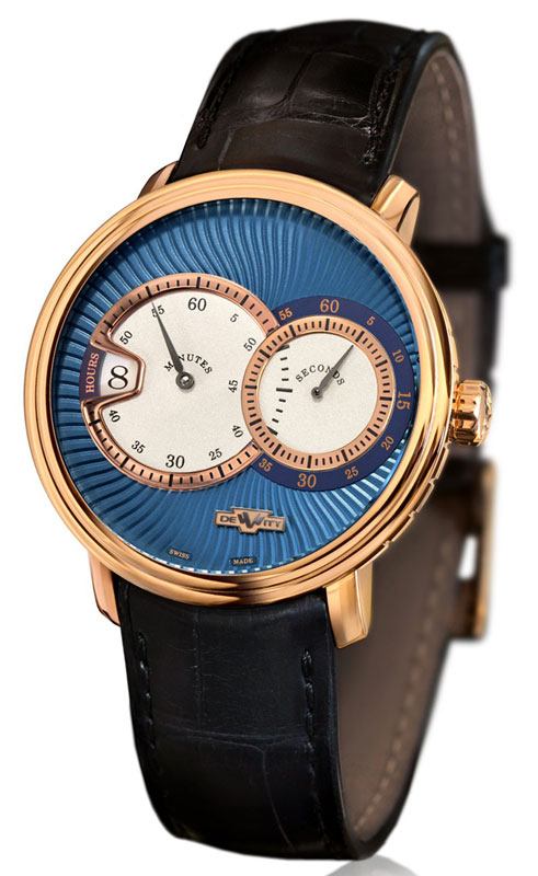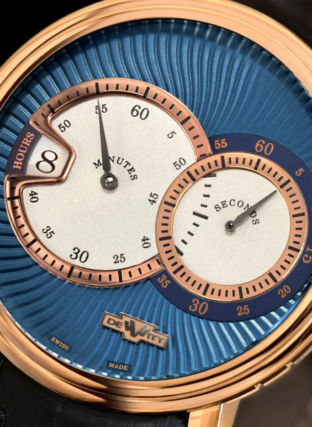 Модель Classic Jumping Hour от швейцарской часовой компании DeWitt имеет круглый полированный корпус, изготовленный из 18-каратного розового золота, диаметром 40 мм, водонепроницаемый до 30 метров. На торце рифленой заводной головки, расположенной на 3 часах, выгравирован логотип бренда DeWitt. Сапфировое стекло защищает циферблат синего цвета, гильошированный в виде волнистых солнечных лучей. Модель оснащена модифицированным швейцарским автоматическим механизмом ETA на 21 камне, с балансовой частотой 28800 полуколебаний в час (4 гц), 42-часовым запасом хода, функциями индикации часов (посредством соответствующего "прыгающего" цифрового указателя в апертуре, расположенной на 9 часах), минут (на децентрализованном круглом аналоговом указателе, расположенном на 9 часах, ближе к центру циферблата) и секунд (на децентрализованном круглом аналоговом указателе, расположенном на 3 часах). Минутный и секундный указатели окаймлены накладными кольцами золотого цвета, с соответствующими разметками. Поставляется на черном ремешке из кожи аллигатора с застежкой из 18-каратного розового золота.