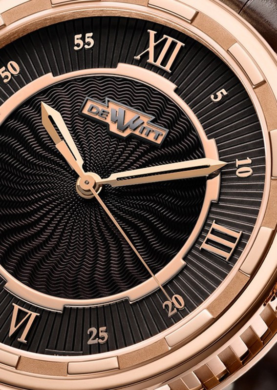 Twenty-8-Eight Automatic – это часы, воплощающие идею изысканности и целостности. Два вида орнамента делят гильошированный циферблат часов на две зоны. Извилистые линии центрального рисунка напоминают языки пламени. При малейшем движении руки они оживляют циферблат красивой игрой света. Второй орнамент нанесен по окружности циферблата и представляет собой абсолютно прямые солнечные лучи, упорядочивающие дизайн. Благодаря большим римским цифрам, расположенным в четырех стратегических точках, и маленьким арабским цифрам, нанесенным через пятиминутные интервалы, время никогда еще не читалось так легко. Часы Twenty-8-Eight Automatic выпущены в корпусе диаметром 43 мм из розового золота 18к. Внутри часов Twenty-8-Eight Automatic находится компактный и надежный часовой механизм, показывающий время с помощью часовой, минутной и центральной секундной стрелок. Часовая и минутная стрелки имеют форму обоюдоострого меча с прорезью посредине. Элегантная тонкая секундная стрелка грациозно скользит по циферблату. Декоративная отделка часов Twenty-8-Eight Automatic отвечает самым высоким стандартам Мануфактуры DeWitt и включает в себя такие приемы, как сатинирование, полировка, снятие фасок. Качество окончательной отделки также позволяет оценить сапфировое стекло задней крышки, сквозь которое хорошо виден великолепный ротор автоматического завода собственной разработки DeWitt. Заводная коронка и золотая застежка ремешка отмечены миниатюрной монограммой «W». Часы комплектуются ремешком из кожи аллигатора с застежкой из розового золота 18к.