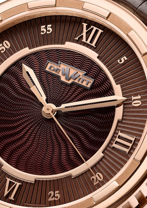 Twenty-8-Eight Automatic – это часы, воплощающие идею изысканности и целостности. Два вида орнамента делят гильошированный циферблат часов на две зоны. Извилистые линии центрального рисунка напоминают языки пламени. При малейшем движении руки они оживляют циферблат красивой игрой света. Второй орнамент нанесен по окружности циферблата и представляет собой абсолютно прямые солнечные лучи, упорядочивающие дизайн. Благодаря большим римским цифрам, расположенным в четырех стратегических точках, и маленьким арабским цифрам, нанесенным через пятиминутные интервалы, время никогда еще не читалось так легко. Часы Twenty-8-Eight Automatic выпущены в корпусе диаметром 43 мм из розового золота 18к. Внутри часов Twenty-8-Eight Automatic находится компактный и надежный часовой механизм, показывающий время с помощью часовой, минутной и центральной секундной стрелок. Часовая и минутная стрелки имеют форму обоюдоострого меча с прорезью посредине. Элегантная тонкая секундная стрелка грациозно скользит по циферблату. Декоративная отделка часов Twenty-8-Eight Automatic отвечает самым высоким стандартам Мануфактуры DeWitt и включает в себя такие приемы, как сатинирование, полировка, снятие фасок. Качество окончательной отделки также позволяет оценить сапфировое стекло задней крышки, сквозь которое хорошо виден великолепный ротор автоматического завода собственной разработки DeWitt. Заводная коронка и золотая застежка ремешка отмечены миниатюрной монограммой «W». Часы комплектуются ремешком из кожи аллигатора с застежкой из розового золота 18к.