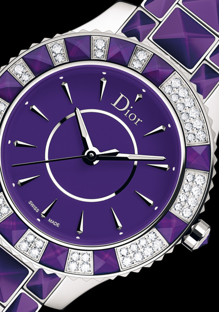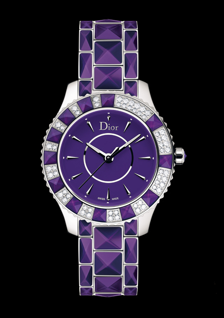 водонепроницаемость 50 м, вращающийся безель из фиолетовых сапфиров и 56-ти белых бриллиантов