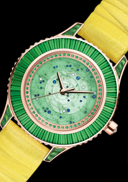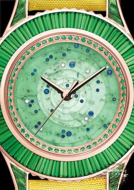водонепроницаемость 50 м, корпус инкрустирован зелеными багетными цаворитами