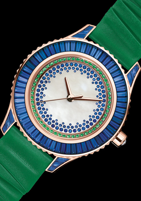 водонепроницаемость 50 м, корпус инкрустирован синими багетными сапфирами
