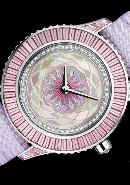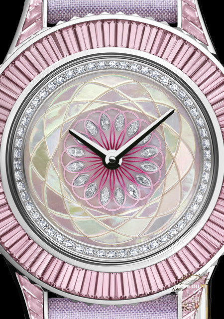 водонепроницаемость 50 м, корпус инкрустирован розовыми багетными сапфирами