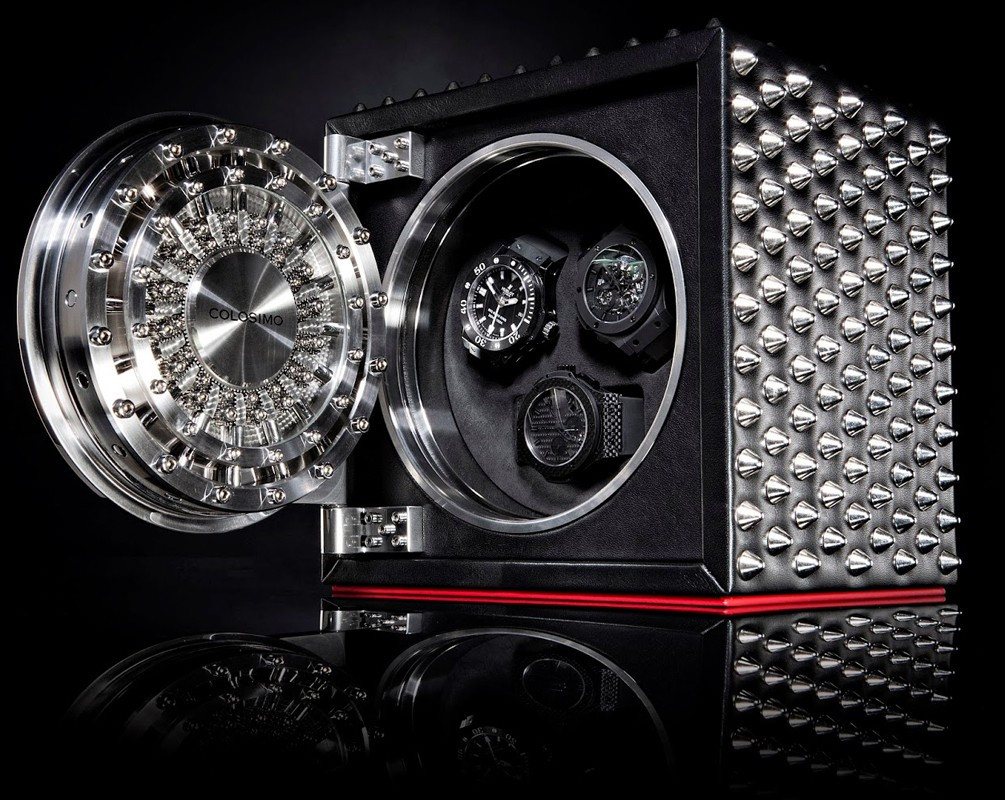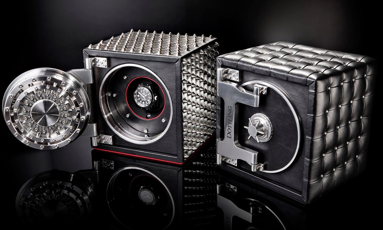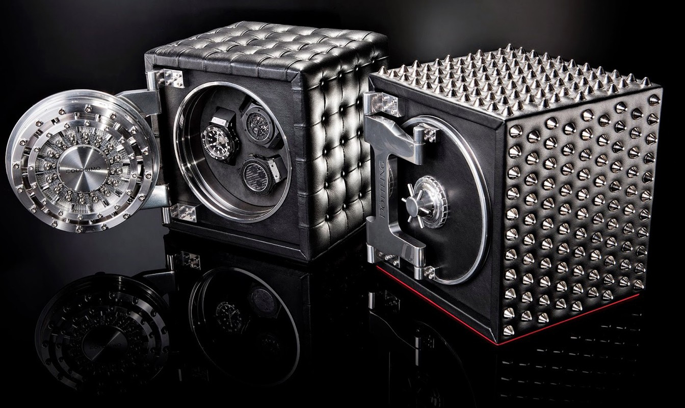 Сейф Doettling Colosimo The Spike представлен в корпусе из нержавеющей стали и кожи. Его поверхность украшают стальные шипы. Размер сейфа 21 х 21 х 20 см, вес 14 кг. Внутри находится модуль для автоматического завода 3-х часов.