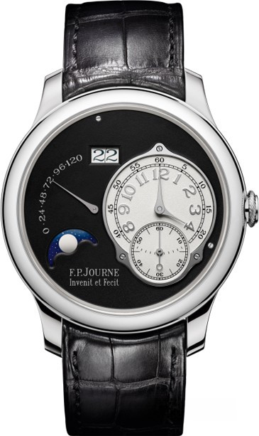 Часы F.P. Journe Boutique Black Label Octa Lune представлены в корпусе из платины 950 размером 40 мм водонепроницаемостью 30 метров. Внутри корпуса установлен автоматический механизм, Калибр 1300.3, обладающий запасом хода 160 часов. На черном с серебристым циферблате отображаются часы, минуты, секунды, дата, запас хода, фаза луны. Часы поставляются на ремешке из кожи аллигатора с вставкой из платины 950.