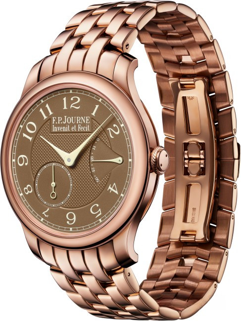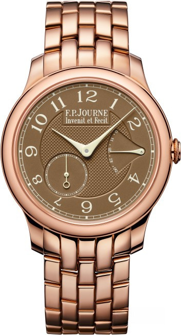 F.P. Journe Souveraine Chronometre выпущены в корпусе из розового золота 18к размером 40 х 8 мм и обладают водонепроницаемостью до 30 метров. На коричневом гильошированном циферблате отображаются часы и минуты посредством центральных стрелок, малая секундная стрелка расположена на 7-ми часах, а индикатор запаса хода - на 3-х часах. Внутри корпуса находится мануфактурный механизм с ручным заводом 1304, обладающий запасом хода 56 часов. Часы комплектуются браслетом из розового золота 18к.