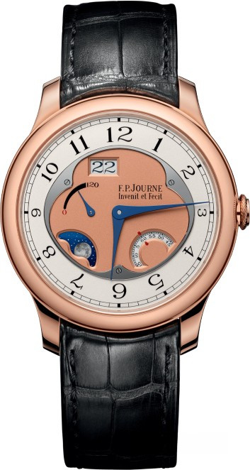 Часы F.P. Journe Divine представлены в корпусе из розового золота 18к размером 40 х 10.7 мм водонепроницаемостью 30 метров. Внутри корпуса установлен автоматический механизм, Калибр 1300.3, обладающий запасом хода 120 часов. На золотистом циферблате отображаются часы, минуты, секунды, запас хода, фаза луны. Часы поставляются на ремешке из кожи аллигатора с золотой застежкой.