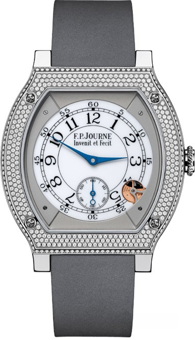 Часы «Elégante» с белым циферблатом. Титановый корпус этой уникальной модели позволяет увидеть элементы часового механизма. F. P. Journe создали революционную концепцию часов. Модель комфортна в использовании и предлагает все плюсы электромеханических часов, обеспечивая автономную работу на протяжении 10 лет использования, и до 18 лет в режиме ожидания. Механический детектор движения позволяет самостоятельно останавливать и запускать ход времени. Приметно через 30 минут после снятия часов, они остановятся. Часы представлены корпусе размером 48 х 40 х 7.95 мм и водонепроницаемостью 30 метров, поставляются на каучуковом ремешке. Корпус инкрустирован белыми бриллиантами.