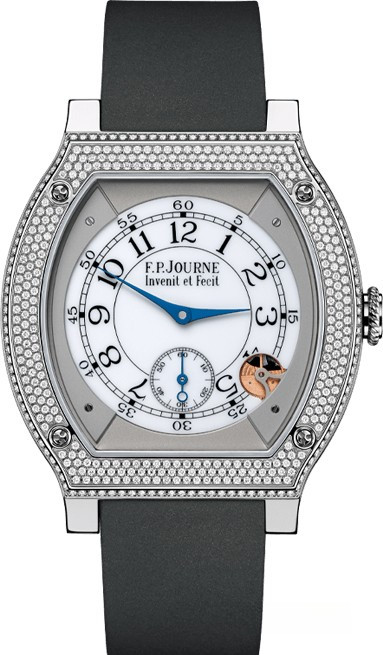 Часы «Elégante» с белым циферблатом. Титановый корпус этой уникальной модели позволяет увидеть элементы часового механизма. F. P. Journe создали революционную концепцию часов. Модель комфортна в использовании и предлагает все плюсы электромеханических часов, обеспечивая автономную работу на протяжении 10 лет использования, и до 18 лет в режиме ожидания. Механический детектор движения позволяет самостоятельно останавливать и запускать ход времени. Приметно через 30 минут после снятия часов, они остановятся. Часы представлены корпусе размером 48 х 40 х 7.95 мм и водонепроницаемостью 30 метров, поставляются на каучуковом ремешке. Корпус инкрустирован белыми бриллиантами.