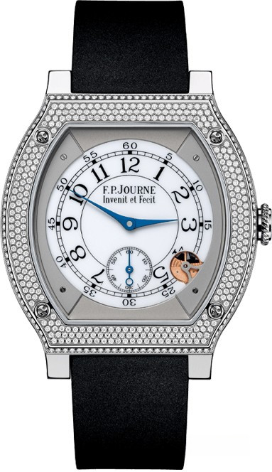 Часы «Elégante» с белым циферблатом. Титановый корпус этой уникальной модели позволяет увидеть элементы часового механизма. F. P. Journe создали революционную концепцию часов. Модель комфортна в использовании и предлагает все плюсы электромеханических часов, обеспечивая автономную работу на протяжении 10 лет использования, и до 18 лет в режиме ожидания. Механический детектор движения позволяет самостоятельно останавливать и запускать ход времени. Приметно через 30 минут после снятия часов, они остановятся. Часы представлены корпусе размером 48 х 40 х 7.95 мм и водонепроницаемостью 30 метров, поставляются на каучуковом ремешке. Корпус инкрустирован белыми бриллиантами.