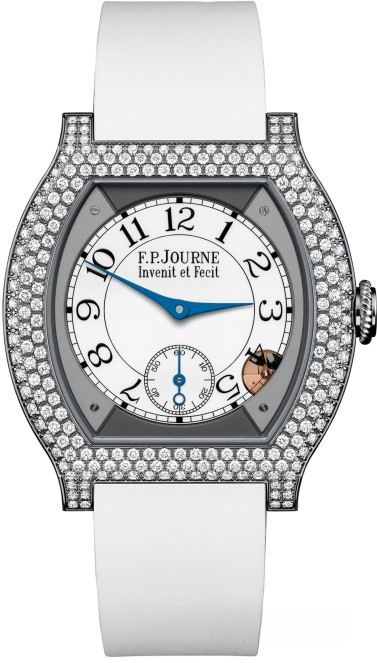 Женские часы «Elégante» с белым циферблатом. Титановый корпус этой уникальной модели позволяет увидеть элементы часового механизма. F. P. Journe создали революционную концепцию часов исключительно для дам, сочетая в ней женственность, элегантность и аккуратность. Модель комфортна в использовании и предлагает все плюсы электромеханических часов, обеспечивая автономную работу на протяжении 10 лет использования, и до 18 лет в режиме ожидания. Механический детектор движения позволяет самостоятельно останавливать и запускать ход времени. Приметно через 30 минут после снятия часов, они остановятся. Когда же Вы снова наденете «Elégante», часы автоматически установят правильное время, выбрав кратчайший путь к маркерам с целью энергосбережения. Часы поставляются на каучуковом ремешке. Корпус инкрустирован белыми бриллиантами.