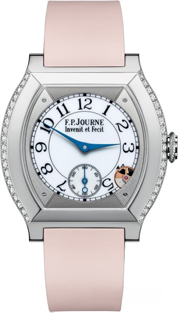 Женские часы «Elégante» с белым циферблатом. Титановый корпус этой уникальной модели инкрустирован белыми бриллиантами. Он позволяет увидеть элементы часового механизма. F. P. Journe создали революционную концепцию часов исключительно для дам, сочетая в ней женственность, элегантность и аккуратность. Модель комфортна в использовании и предлагает все плюсы электромеханических часов, обеспечивая автономную работу на протяжении 10 лет использования, и до 18 лет в режиме ожидания. Механический детектор движения позволяет самостоятельно останавливать и запускать ход времени. Приметно через 30 минут после снятия часов, они остановятся. Когда же Вы снова наденете «Elégante», часы автоматически установят правильное время, выбрав кратчайший путь к маркерам с целью энергосбережения.