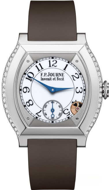 Женские часы «Elégante» с белым циферблатом. Титановый корпус этой уникальной модели инкрустирован белыми бриллиантами. Он позволяет увидеть элементы часового механизма. F. P. Journe создали революционную концепцию часов исключительно для дам, сочетая в ней женственность, элегантность и аккуратность. Модель комфортна в использовании и предлагает все плюсы электромеханических часов, обеспечивая автономную работу на протяжении 10 лет использования, и до 18 лет в режиме ожидания. Механический детектор движения позволяет самостоятельно останавливать и запускать ход времени. Приметно через 30 минут после снятия часов, они остановятся. Когда же Вы снова наденете «Elégante», часы автоматически установят правильное время, выбрав кратчайший путь к маркерам с целью энергосбережения. Часы поставляются на каучуковом ремешке.