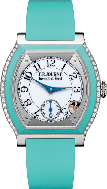 Женские часы «Elégante» с белым циферблатом. Титановый корпус этой уникальной модели инкрустирован белыми бриллиантами. Он позволяет увидеть элементы часового механизма. F. P. Journe создали революционную концепцию часов исключительно для дам, сочетая в ней женственность, элегантность и аккуратность. Модель комфортна в использовании и предлагает все плюсы электромеханических часов, обеспечивая автономную работу на протяжении 10 лет использования, и до 18 лет в режиме ожидания. Механический детектор движения позволяет самостоятельно останавливать и запускать ход времени. Приметно через 30 минут после снятия часов, они остановятся. Когда же Вы снова наденете «Elégante», часы автоматически установят правильное время, выбрав кратчайший путь к маркерам с целью энергосбережения.