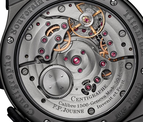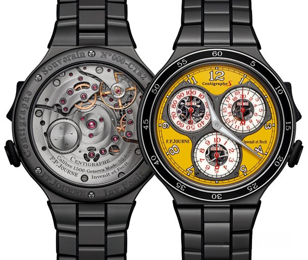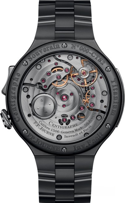 Часы F.P. Journe Centigraphe Souverain представлены в корпусе из титана размером 40 мм. Внутри корпуса установлен с ручным заводом, Калибр 1506, обладающий запасом хода 80 часов. На желтом циферблате отображаются часы, минуты, секунды, тахиметр. Часы поставляются на титановом браслете. Водонепроницаемость корпуса составляет 30 метров. Секундомер точностью до 1/100 секунды.