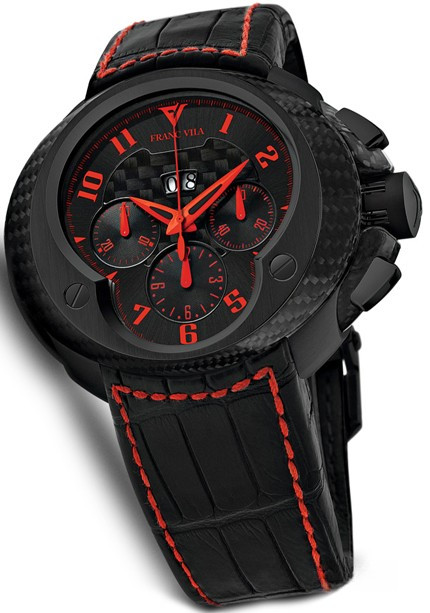 Часы Franc Vila Cobra Chrono представлены в корпусе размером 58 x 45 х 15.9 мм из титана с покрытием DLC, карбона водонепроницаемостью 300 метров. Внутри корпуса установлен автоматический механизм, Калибр FV 8E, хронограф, обладающий запасом хода 42 часа. На черном карбоновом циферблате отображаются часы, минуты, секунды, дата, накопители хронографа. Часы поставляются на ремешке из кожи аллигатора с титановой вставкой.