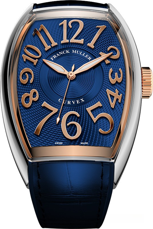 Часы Franck Muller Cintree Curvex CX представлены в корпусе из розового золота 18к и нержавеющей стали размером 35.9 х 50.3 мм водонепроницаемостью 30 метров. Внутри корпуса установлен автоматический механизм, Калибр FM 800, обладающий запасом хода 42 часа. На синем гильошированном циферблате отображаются часы, минуты, секунды. Часы поставляются на ремешке из кожи аллигатора с застежкой из нержавеющей стали.