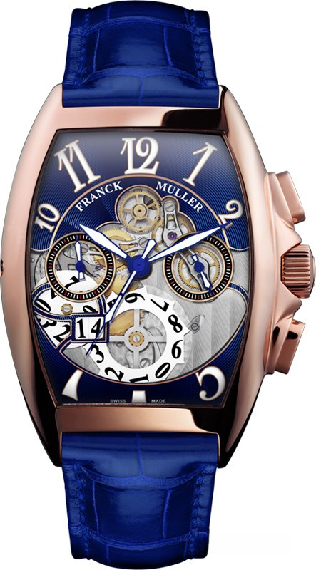 Часы Franck Muller Cintree Curvex Grande Date представлены в корпусе из розового золота 18к размером 39.5 х 55.3 х 9.35 мм и водонепроницаемостью 30 метров. Внутри корпуса установлен автоматический механизм, обладающий запасом хода 46 часов. На синем циферблате отображаются часы, минуты, секунды, дата, накопители хронографа. Часы поставляются на ремешке из кожи аллигатора с золотой застежкой.