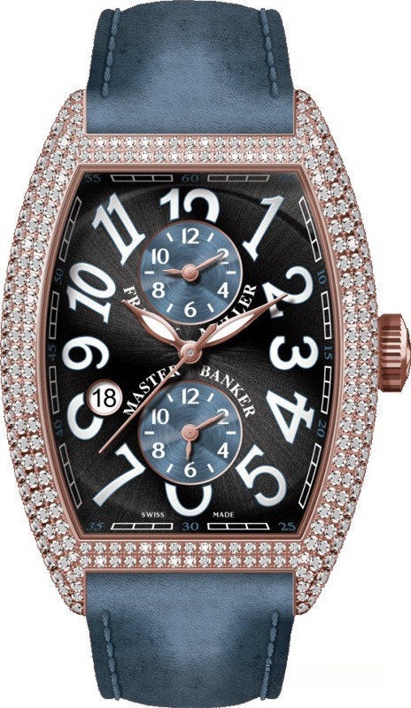 Часы Franck Muller Master Banker Asia Exclusive представлены в корпусе из розового золота 18к размером 39.6 x 55.4 мм водонепроницаемостью 30 метров. Внутри корпуса установлен автоматический механизм, Калибр MVD 2800-MBSC, обладающий запасом хода 42 часа. На черном с синим циферблате отображаются часы, минуты, секунды, дата, время второго часового пояса. Часы поставляются на кожаном ремешке с вставкой из розового золота 18к. Корпус инкрустирован белыми бриллиантами.