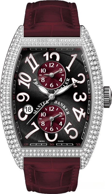 Часы Franck Muller Master Banker Asia Exclusive представлены в корпусе из нержавеющей стали размером 39.6 x 55.4 мм водонепроницаемостью 30 метров. Внутри корпуса установлен автоматический механизм, Калибр MVD 2800-MBSC, обладающий запасом хода 42 часа. На черном с бордовым циферблате отображаются часы, минуты, секунды, дата, время второго часового пояса. Часы поставляются на ремешке из кожи аллигатора с вставкой из нержавеющей стали. Корпус инкрустирован белыми бриллиантами.