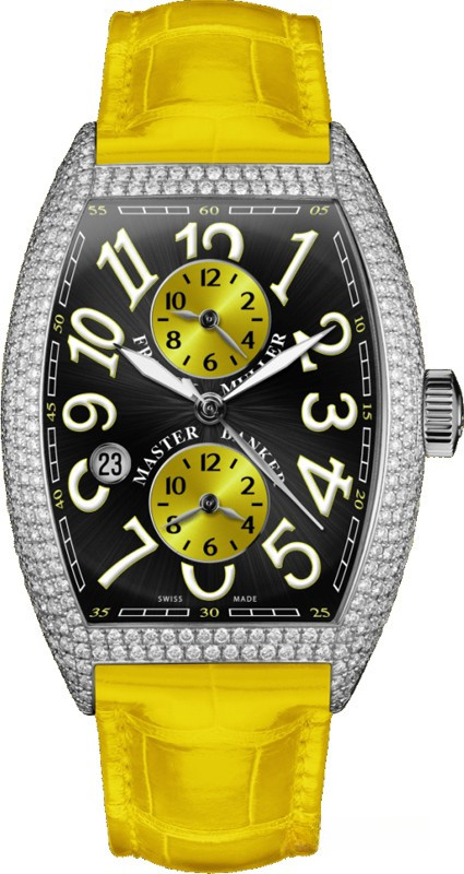 Часы Franck Muller Master Banker Asia Exclusive представлены в корпусе из нержавеющей стали размером 39.6 x 55.4 мм водонепроницаемостью 30 метров. Внутри корпуса установлен автоматический механизм, Калибр MVD 2800-MBSC, обладающий запасом хода 42 часа. На черном с желтым циферблате отображаются часы, минуты, секунды, дата, время второго часового пояса. Часы поставляются на ремешке из кожи аллигатора с вставкой из нержавеющей стали. Корпус инкрустирован белыми бриллиантами.